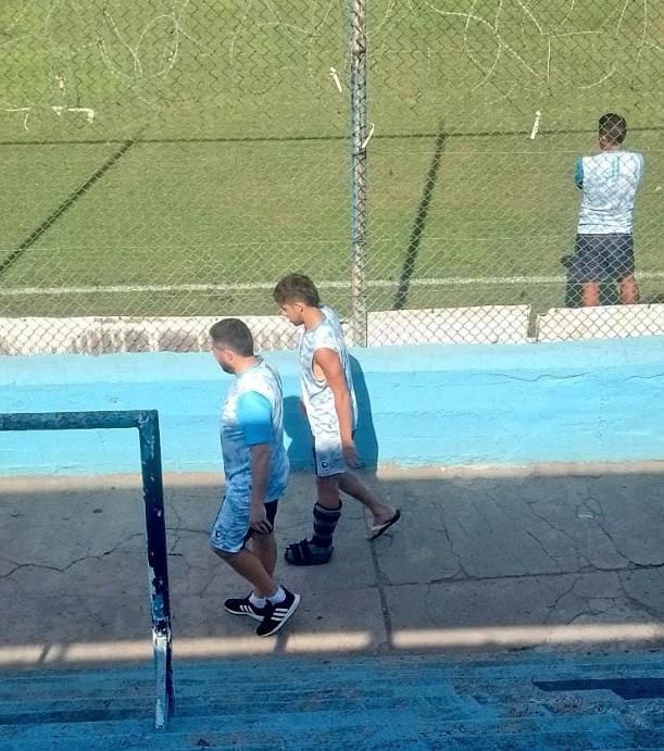 El medio partidario Locos Por Temperley publicó una foto del futbolista retirándose del entrenamiento en el Beranger acompañado por el médico del plantel y con una bota en la pierna izquierda.