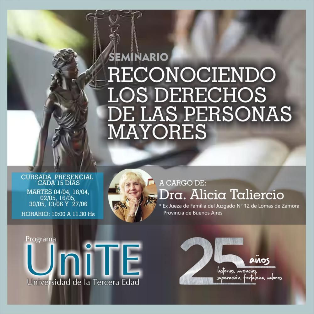 El próximo martes 4 de abril será la fecha de inicio de un seminario gratuito que tratará como tema principal los derechos de las personas mayores enfocado desde distintos ángulos. El curso estará a cargo de la doctora Alicia Taliercio, exjueza del Juzgado de Familia Nº12 de Lomas, y se desarrollará en la Universidad de Lomas con el apoyo del programa UniTE (Universidad de la Tercera Edad).
