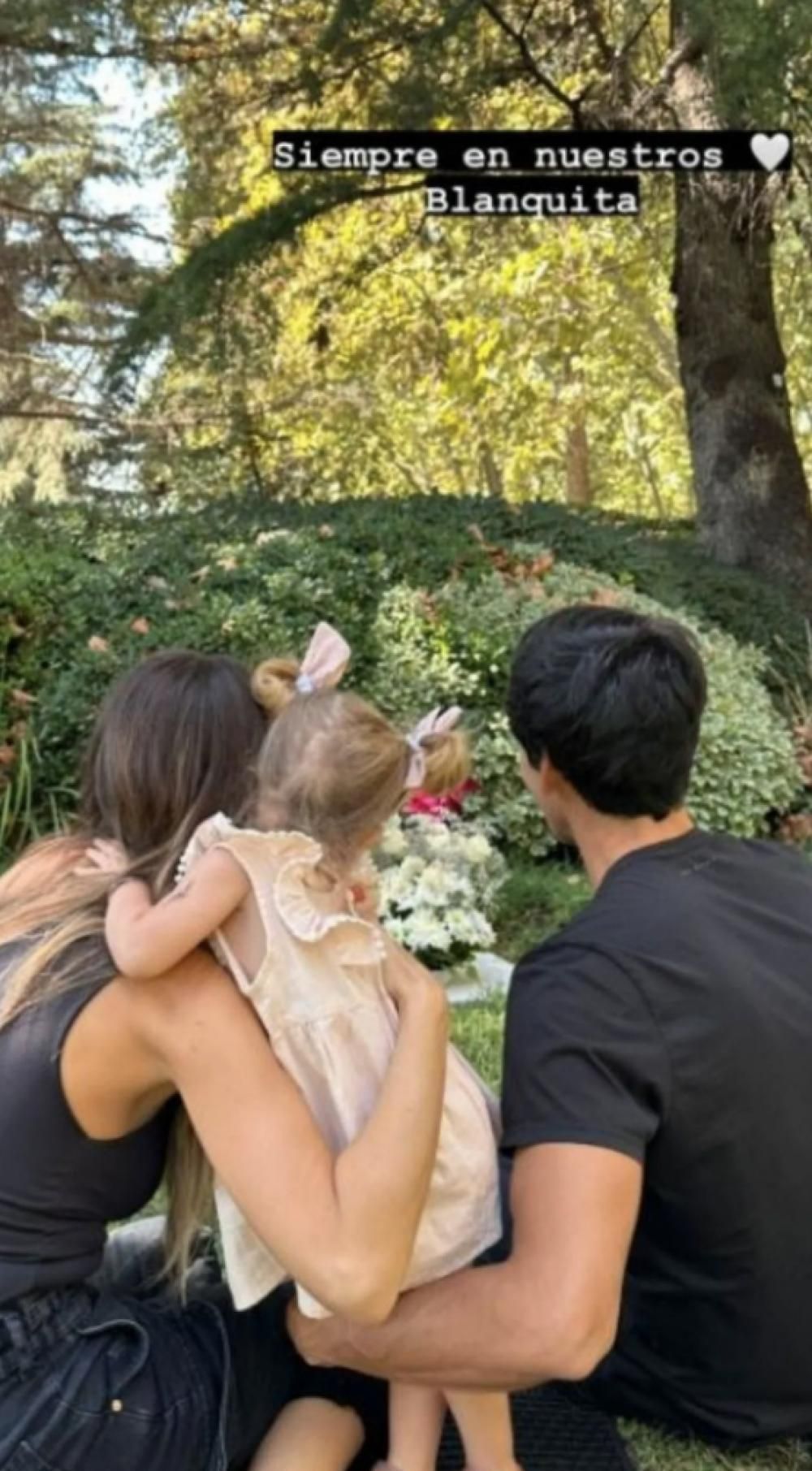 La modelo compartió a través de sus stories de Instagram una foto de espaldas, abrazando a Ana junto a su hermano Guillermo; los tres frente a la tumba de Blanca, repleta de flores blancas y rosadas.