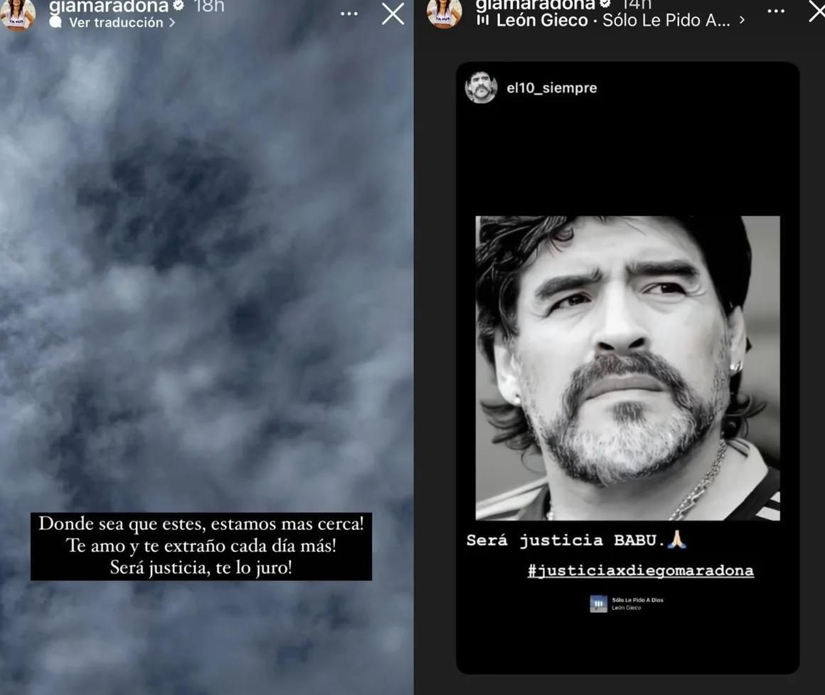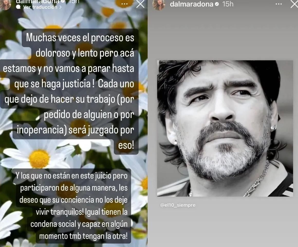Ante este avance de la causa, Dalma y Gianinna Maradona hicieron una sentidas publicaciones en las redes sociales. "Muchas veces el proceso es doloroso y lento, pero acá estamos y no vamos a parar hasta que se haga justicia. Cada uno que dejó de hacer su trabajo (por pedido de alguien o por inoperancia) será juzgado por eso. Y los que no están en este juicio, pero participaron de alguna manera, les deseo que su conciencia no los deje vivir tranquilos", escribió Dalma desde sus Instagram Stories con a fondo de margaritas y la imagen del "10".