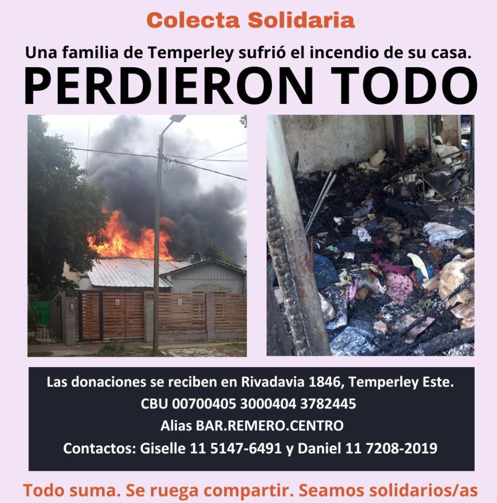 El hecho sucedió la semana pasada cuando un cortocircuito desató las llamas que destruyeron en poco tiempo toda la casa ubicada en Temperley.