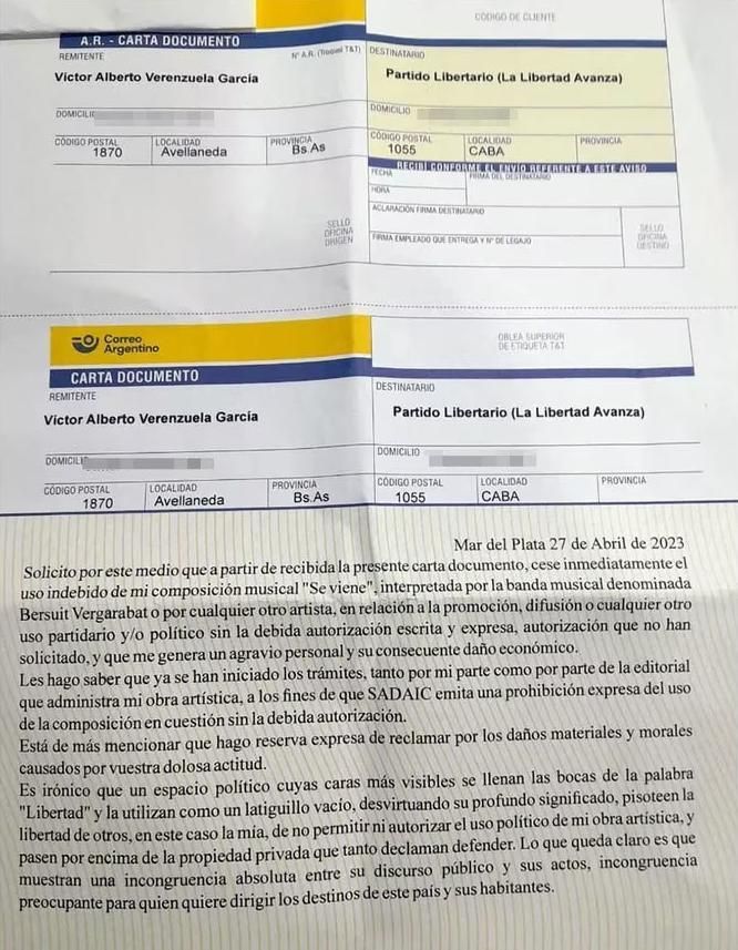 "Solicito por este medio que a partir de recibida la presente carta documento cese inmediatamente el uso indebido de mi composición musical 'Se viene', interpretada por la banda musical denominada Bersuit Vergarabat o por cualquier otro artista, en relación a la promoción, difusión, o cualquier otro uso partidario y/o político sin la debida autorización escrita y expresa, autorización que no han solicitado, y que me genera un agravio personal y su consecuente daño económico", comienza el escrito.