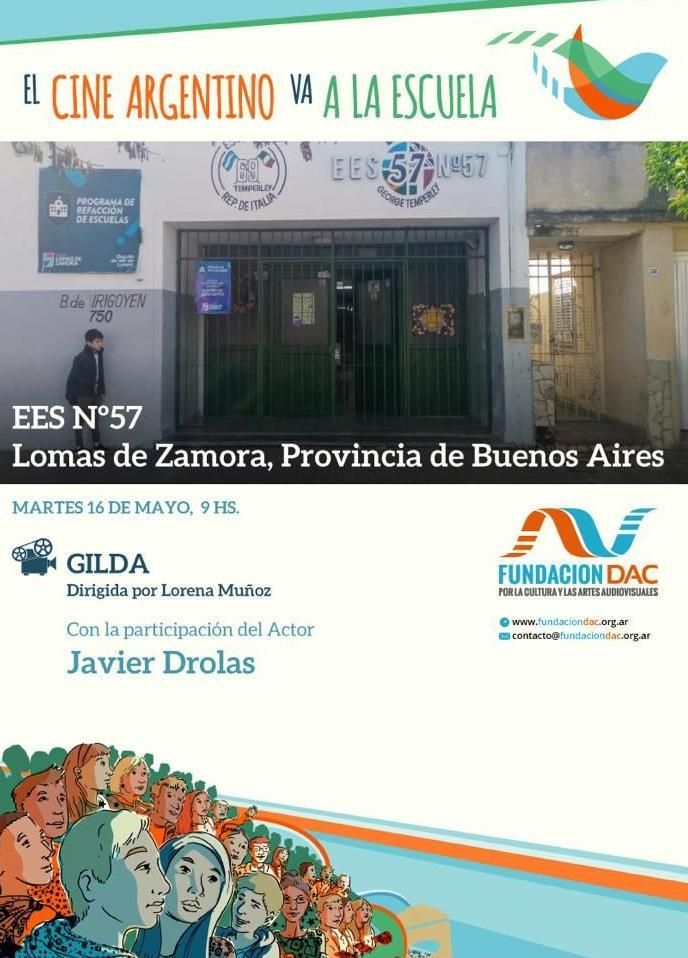 Este martes, la EES Nº 57 de Temperley recibirá la presencia del programa "El Cine Argentino va a la Escuela", de la Fundación DAC, que en conjunto con los docentes, han organizado la proyección de "Gilda", película dirigida por Lorena Laura Muñoz. Al lugar llegará Javier Drolas, actor de la película, para conversar con los estudiantes después de la proyección.