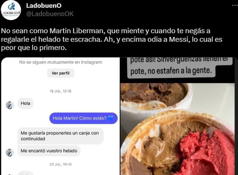 Esto último es lo que intentó hacer el periodista deportivo Martín Liberman al comunicarse con la heladería Lado Bueno para recibir helado a cambio de una mención en redes sociales.