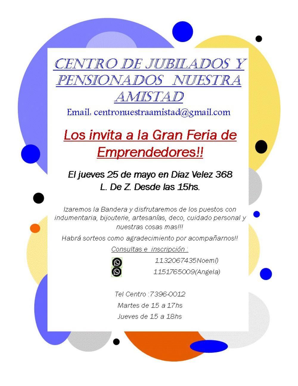 Cabe resaltar que las inscripciones aún se encuentran abiertas y todos los interesados en ser parte de la feria pueden comunicarse a los siguientes teléfonos: 1132067435 (Noemí) o 1151765009 (Ángela). El Centro de Jubilados Nuestra Amistad cobrará $1.000 el bono contribución a los emprendedores para que puedan exhibir sus productos.