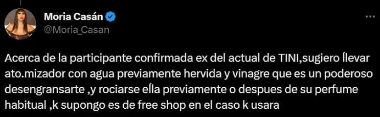 "Acerca de la participante confirmada ex del actual de Tini, sugiero llevar atomizador con agua previamente hervida y vinagre", dijo en Twitter sobre la ex pareja de Rodrigo de Paul.