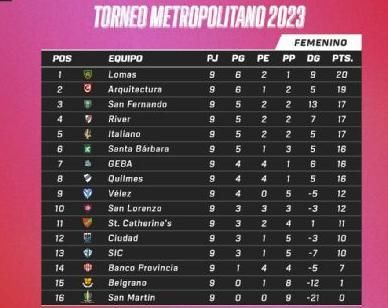 Posiciones: Lomas Athletic 20 puntos; Arquitectura 19; San Fernando, Italiano y River Plate 17; GEBA y Santa Bárbara 16; Vélez Sarsfield y San Lorenzo de Almagro 12; Saint Catherine's 11; Ciudad y SIC 10; Banco Provincia 7; Belgrano Athletic 1 y San Martín 0.