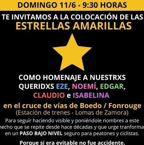 La actividad es organizada por los propios familiares, convocados por la Campaña de Concientización de Estrellas Amarillas y el Municipio de Lomas de Zamora. "Es una manera de seguir adelante. Es para visualizar el peligro, porque es algo latente", remarcó.