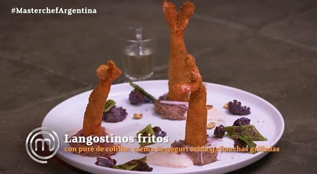 Una vez finalizado su tiempo en la cocina, el bioquímico llevó su plato ante el jurado y presentó unos langostinos fritos con puré de coliflor, crema de yogurt ácida y chauchas grilladas.