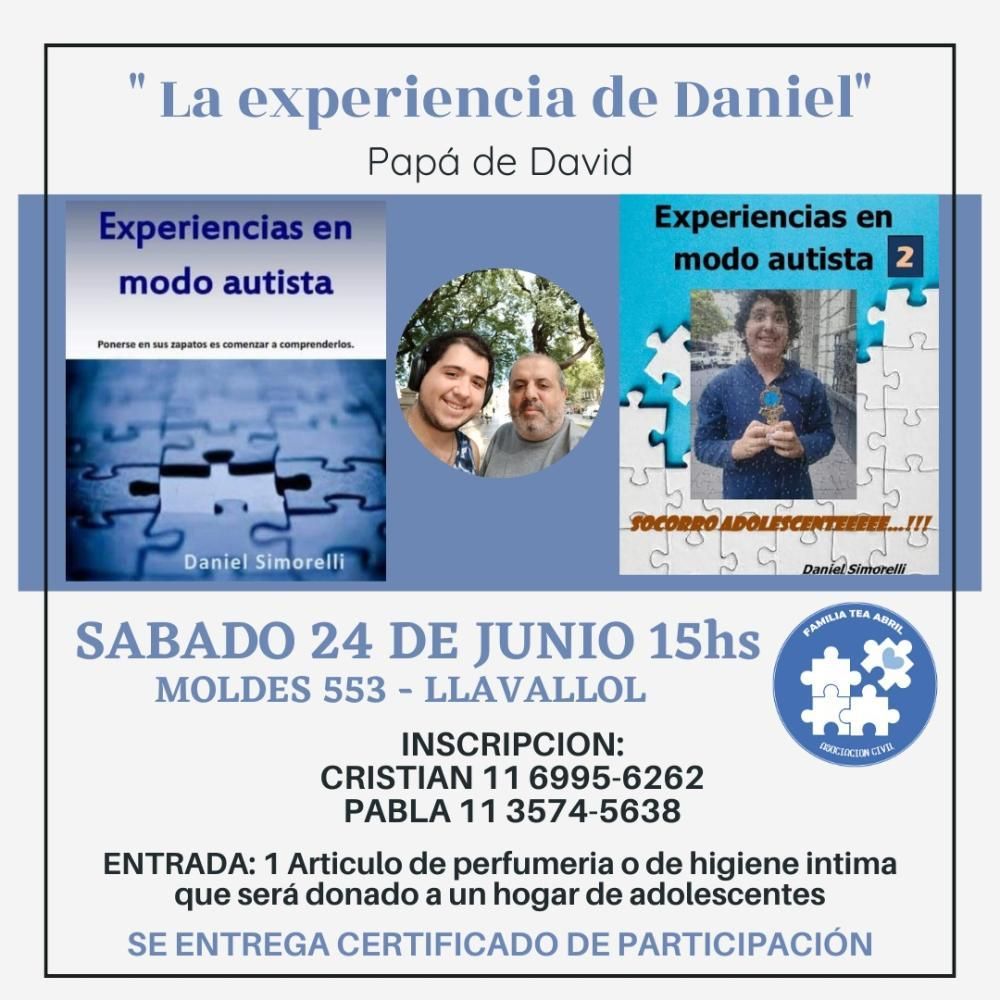 La asociación civil lomense Familia Tea Abril llevará a cabo, el próximo sábado 24 de junio a las 15, la presentación de dos libros del escritor Daniel Simorelli, quien es padre de David, un adolescente con autismo. En los textos plasma su día a día siendo familiar cercano de una persona con el trastorno del espectro autista, haciendo un amplio análisis de la discapacidad en general (desde que uno se entera del diagnóstico) con el fin de que las personas puedan comprender más sobre sus comportamientos.