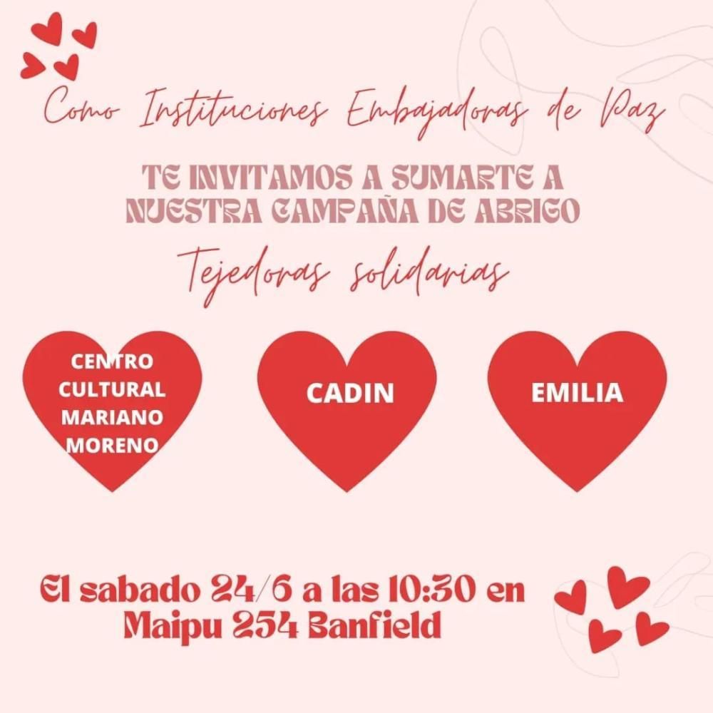 En pleno otoño y con el invierno en la esquina, el Centro Cultural Mariano Moreno de Banfield, en conjunto con el Centro de Acompañamiento del Desarrollo Infantojuvenil y el espacio para el juego, arte y aprendizaje para la primera infancia "Emilia", organizarán una campaña de abrigo llamada "Tejedoras solidarias", en la que invitan a vecinos a sumarse a confeccionar prendas de lana que luego serán destinadas a quienes más lo necesiten.
