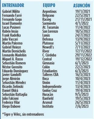Hasta hoy, los DTs con mayor antigüedad son Gabriel Milito, que lleva dos años y medio al frente de Argentinos Juniors, Fernando Farré, que suma más de dos años, y Fernando Gago, que va camino a los dos años. El primero asumió el 19 de enero del 2021, el segundo el 22 de mayo y el tercero el 21 de noviembre del mismo año.