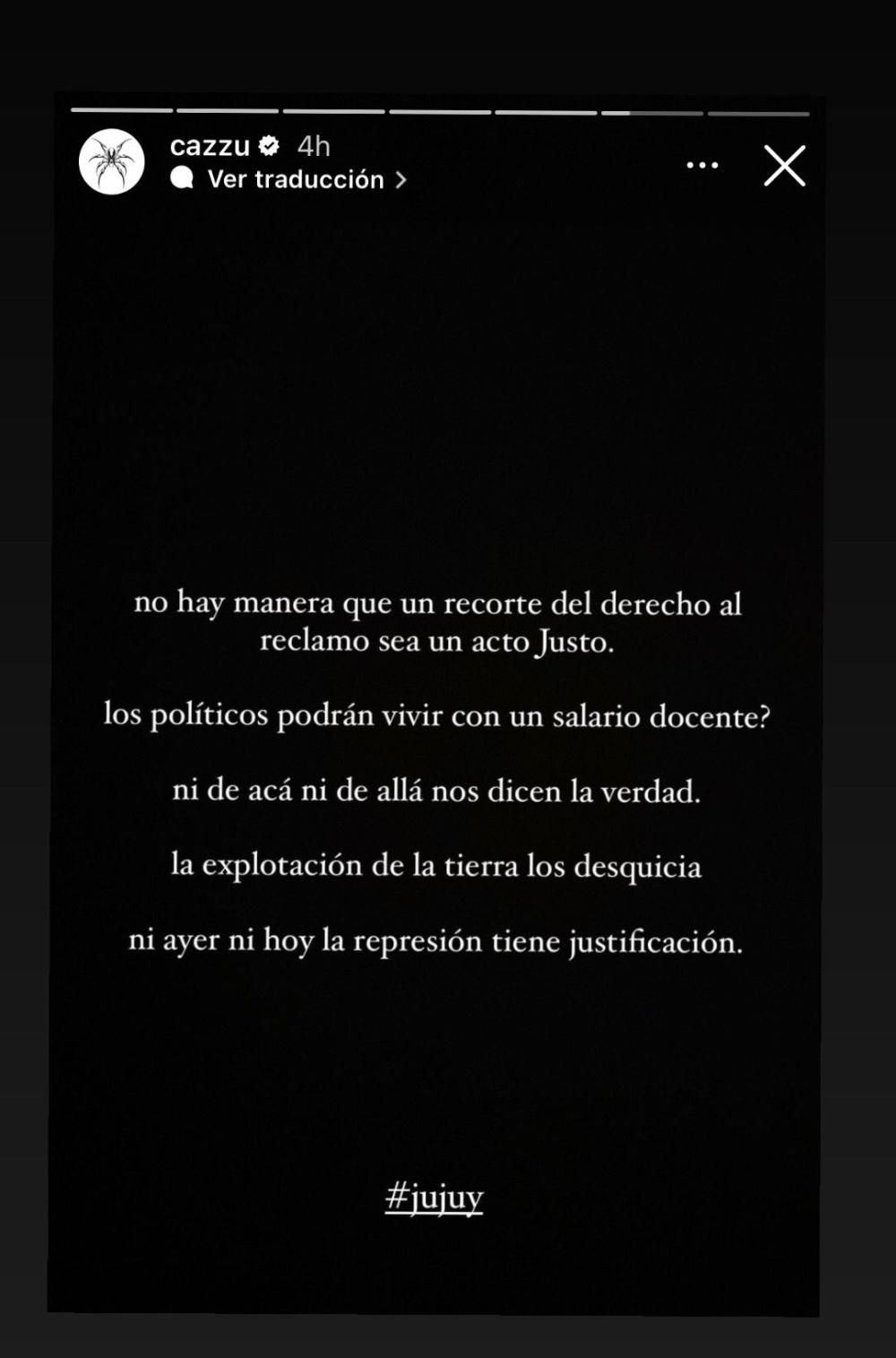 A través de su cuenta de Instagram, Julieta Cazzuchelli condenó la violencia estatal en Jujuy contra manifestantes, pidió por un salario docente digno y se refirió a la extracción de recursos naturales como el litio, otro de los reclamos del pueblo jujeño.