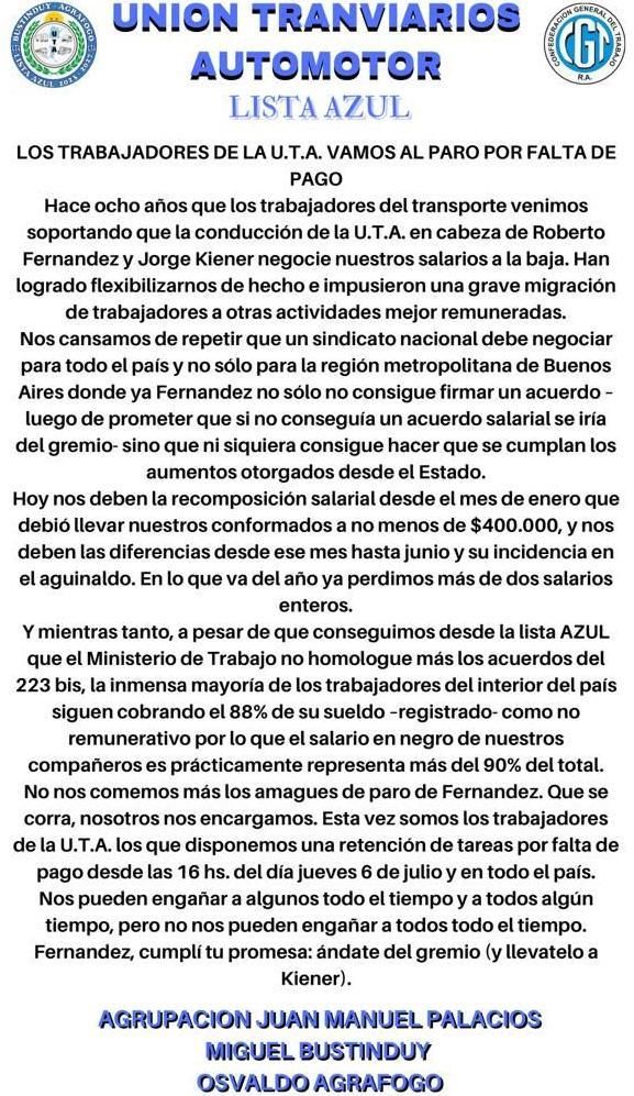 La medida de fuerza incluirá a todos los colectivos del grupo DOTA, que es el más crítico de la gestión del secretario general del sindicato, Roberto Fernández, y la Cámara Autobuses del Sur. En un duro comunicado, acusaron a Fernández de negociar "los salarios a la baja". "Han logrado flexibilizarnos de hecho e impusieron una grave migración de trabajadores a otras actividades mejor remuneradas", denunciaron.