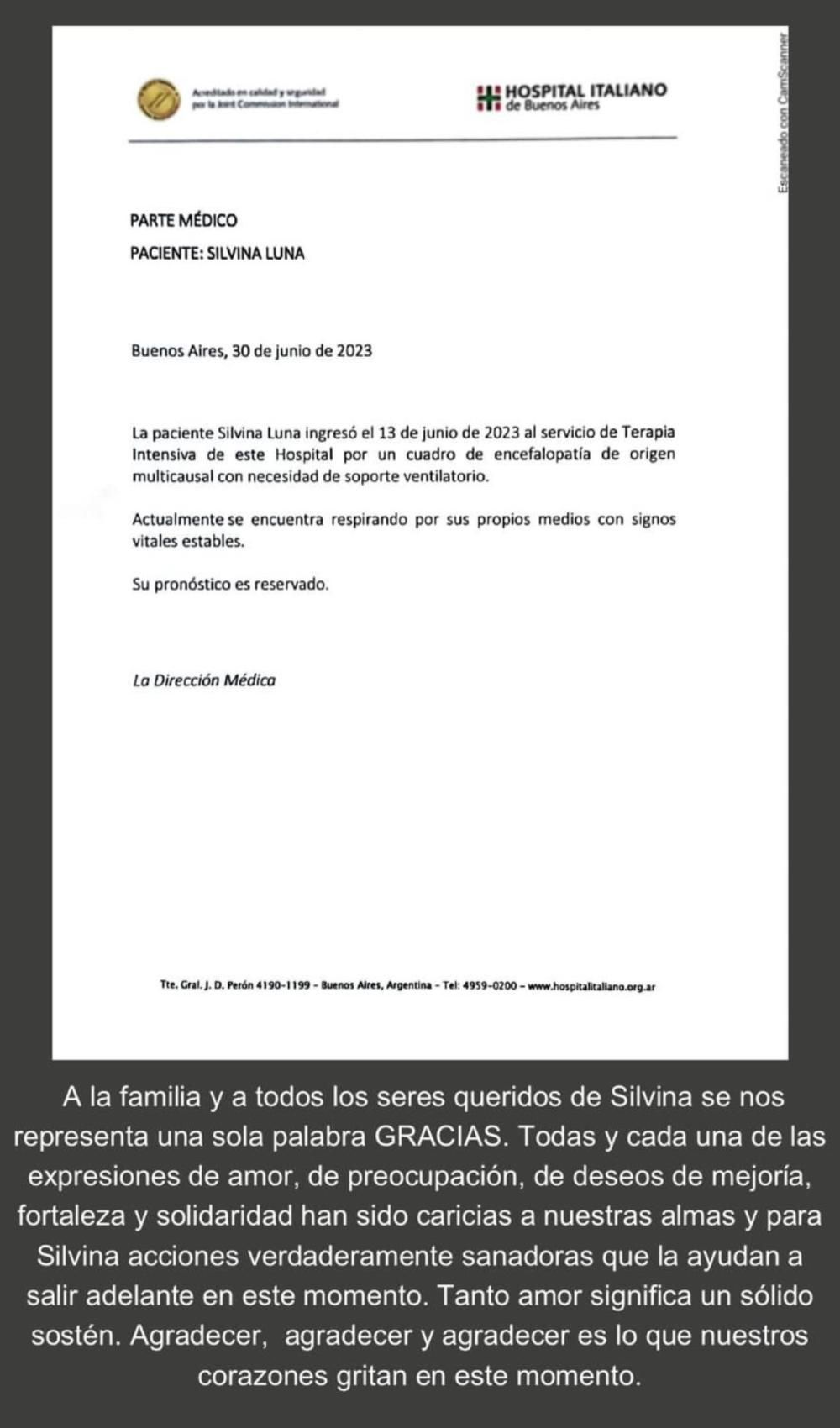 "La paciente Silvina Luna continúa internada en el servicio de Terapia Intensiva. Se encuentra lúcida, sin asistencia ventilatoria médica, con signos vitales estables y su evolución favorable. Permanecerá internada en este mismo servicio, donde se le brindarán los cuidados y servicios necesarios", detalló el parte médico firmado por la Dirección Médica del Hospital Italiano.