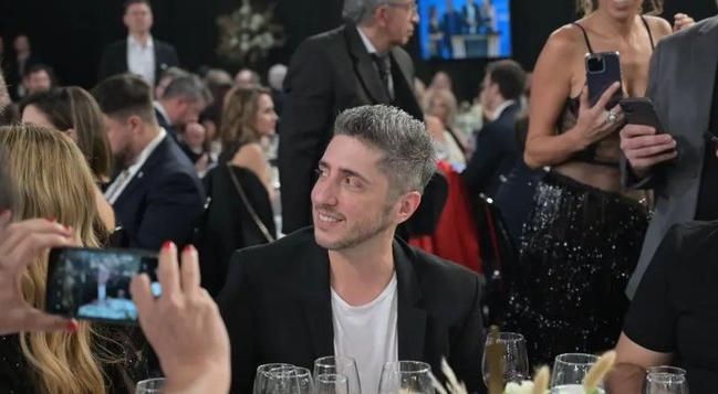 Una hora más tarde de comenzada la entrega, apareció y se sentó en su lugar en la mesa que le correspondía, junto a Jésica Cirio.