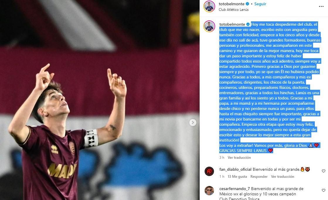Por último, Belmonte agradeció a los hinchas y puso en palabras lo que Lanús significa para él. "Lanús es una gran familia y a todos los siento de esa manera. Por eso ahora que empieza otra etapa, la cual me tiene emocionado y entusiasmado, no quería dejar de escribir esto y desear lo mejor siempre a esta gran institución", cerró.