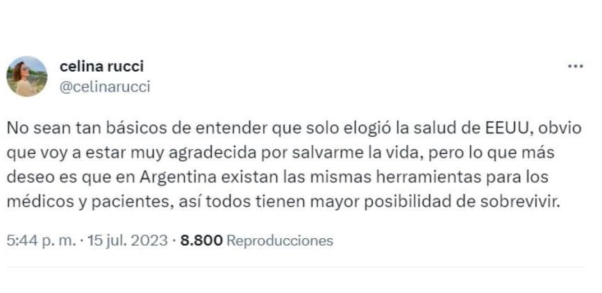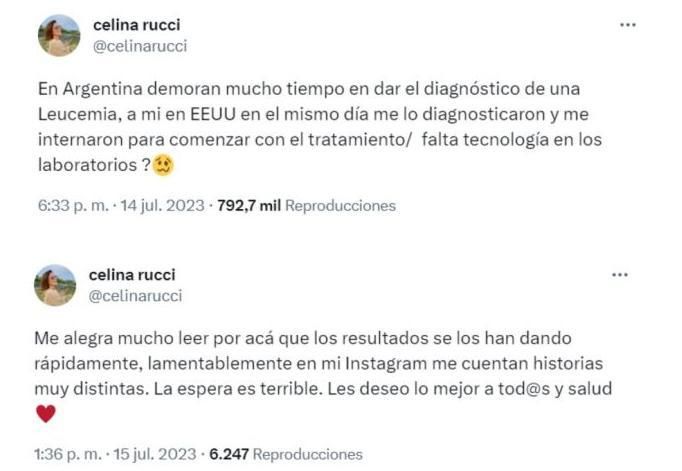 "En Argentina demoran mucho tiempo en dar el diagnóstico de una leucemia, a mí en EEUU en el mismo día me lo diagnosticaron y me internaron para comenzar con el tratamiento. ¿Falta tecnología en los laboratorios?", escribió Celina Rucci en las redes sociales.