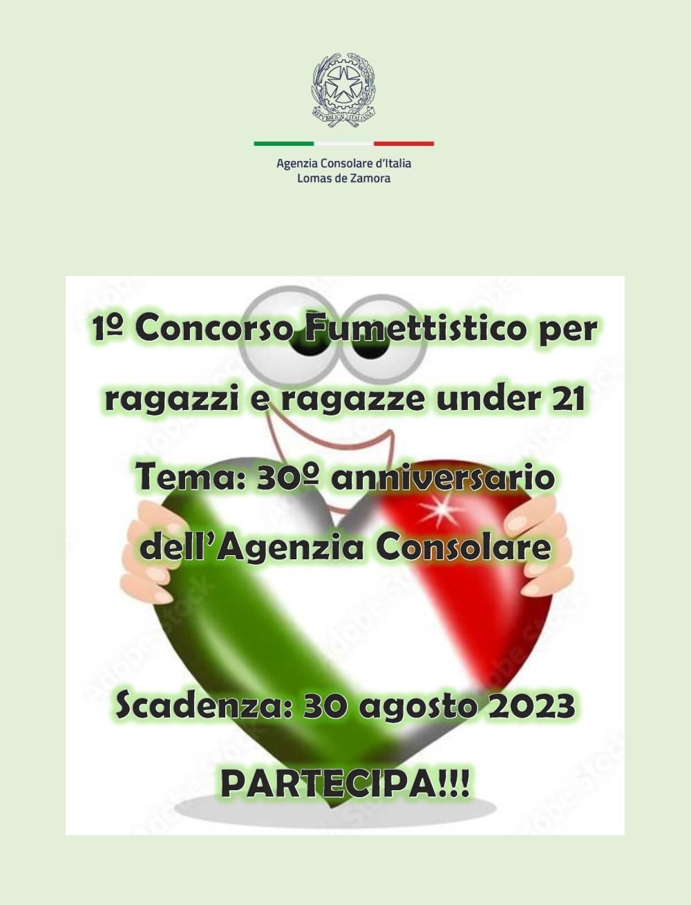 Con motivo de las celebraciones por el cumplimiento de su 30º aniversario, la Agencia Consular de Italia en Lomas organiza el Primer Concurso de Cómics, el cual está dirigido a jóvenes entre 10 y 21 años para que puedan participar de forma individual o en grupo. Una iniciativa que busca "movilizar a las nuevas generaciones y estimular su creatividad".