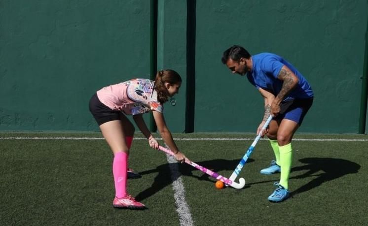 La producción se realizó en un complejo deportivo de zona norte y ambos posaron muy cancheros jugando al fútbol y al hockey.