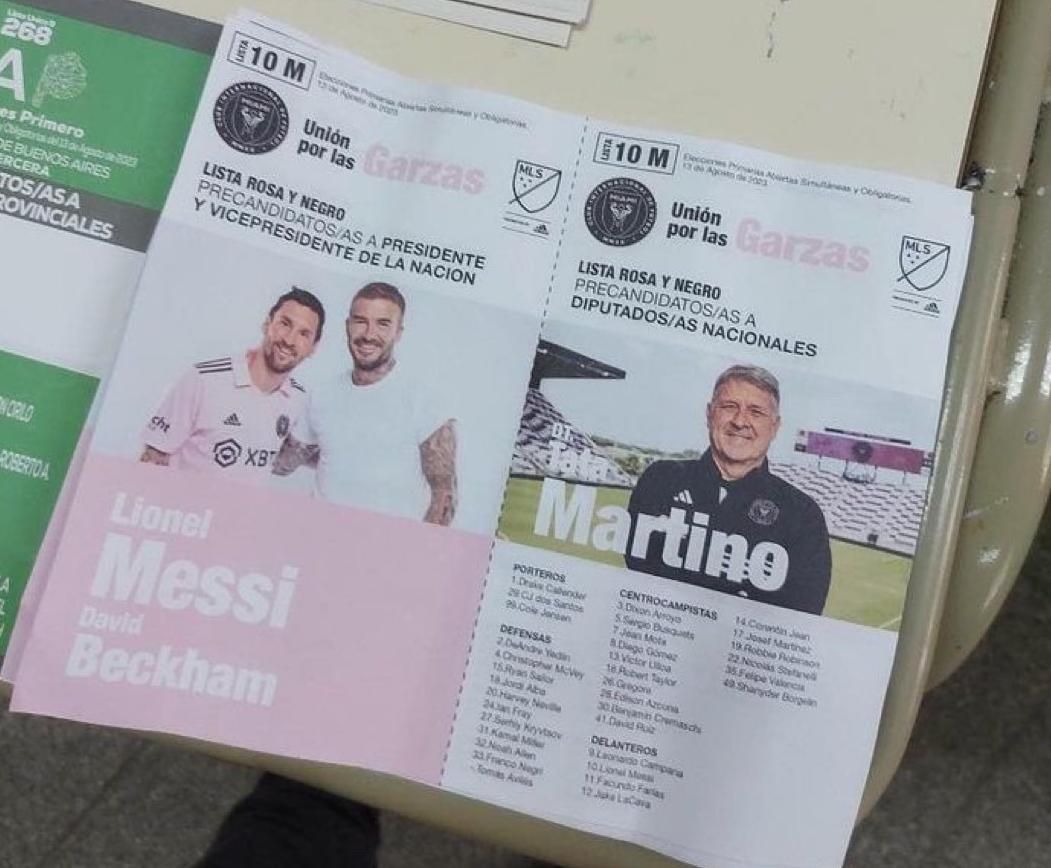 En un colegio de Llavallol, partido de Lomas de Zamora, apareció una boleta que tenía a Lionel Messi como precandidato a presidente y a David Beckham (titular del Inter de Miami) como vice. La lista se llamaba 10M "Unión por las Garzas", en referencia al apodo del equipo estadounidense.