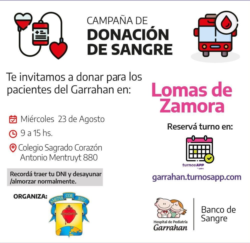 Una nueva colecta de sangre junto al Hospital Garrahan encara el Colegio Sagrado Corazón de Lomas para el miércoles 23 de agosto en el horario de 9 a 15.