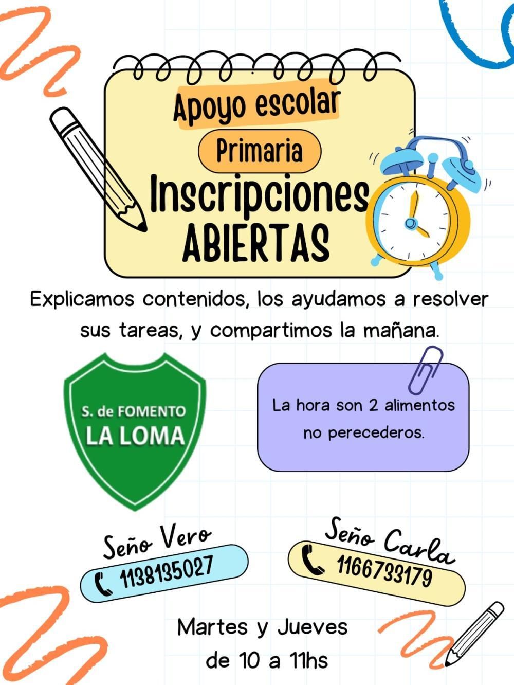La Sociedad de Fomento La Loma de Temperley abrió las inscripciones para realizar apoyo escolar para nivel primario, donde las maestras les explicarán a los chicos y las chicas los diversos contenidos educativos, los ayudarán a resolver las tareas y, entre todos, compartirán una amena mañana.