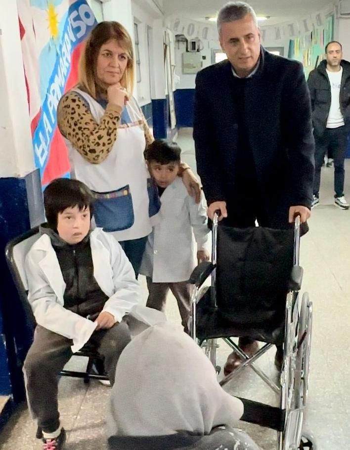 También acompañó al presidente de la fundación, el Secretario de Cultura y Educación, Matías Gasparrini, para hacer la entrega de las dos sillas a los hermanitos Dylan y Agustín que padecen distrofia muscular de Duchenne, lo que no les permite trasladarse por sus propios medios.