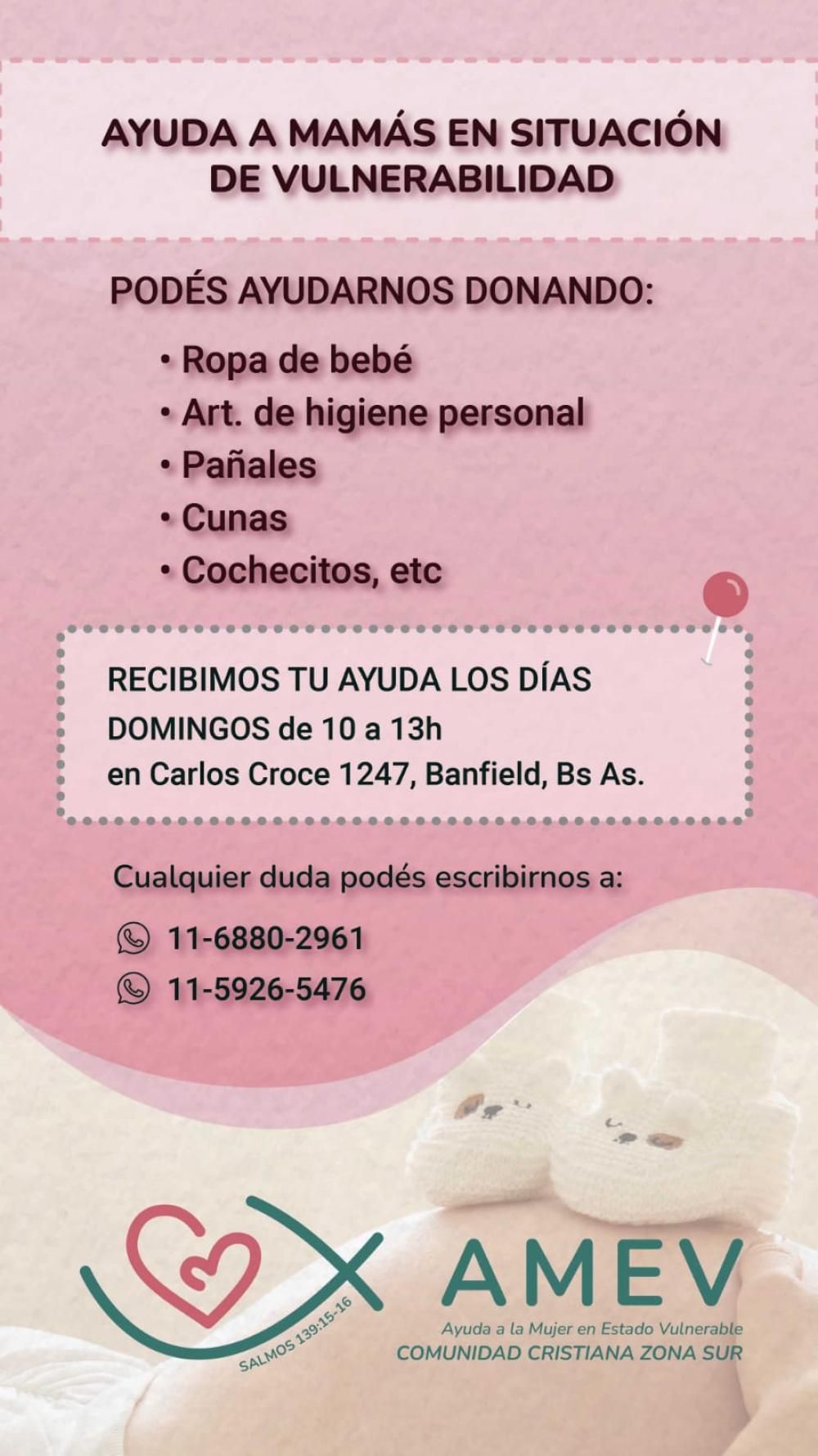 La Comunidad Cristiana Zona Sur, que tiene su sede en Banfield (Carlos Croce 1247), comenzó con un programa de ayuda a mujeres: en este caso reciben donaciones de ropa de bebé y de niños, artículos de higiene personal, pañales, cunas y cochecitos para colaborar con madres en estado de vulnerabilidad.