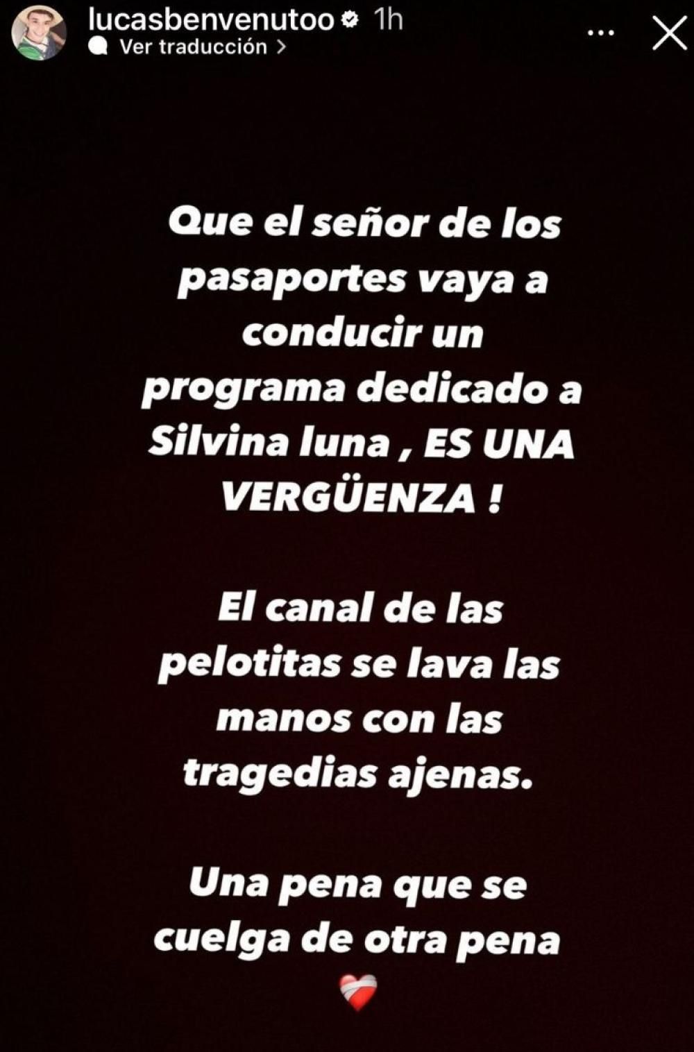 Todo surgió a raíz de os cuestionamientos por la decisión de que Marley estuviera al frente del homenaje a Silvina Luna, ya que no aparecía en la pantalla desde hace meses. Uno de los que criticó esto fue Lucas Benvenuto, quien escribió en una de las historia de su cuenta de Instagram: "Es una vergüenza... El canal de las pelotitas se lava las manos con las tragedias ajenas. Una pena que se cuelga de otra pena".