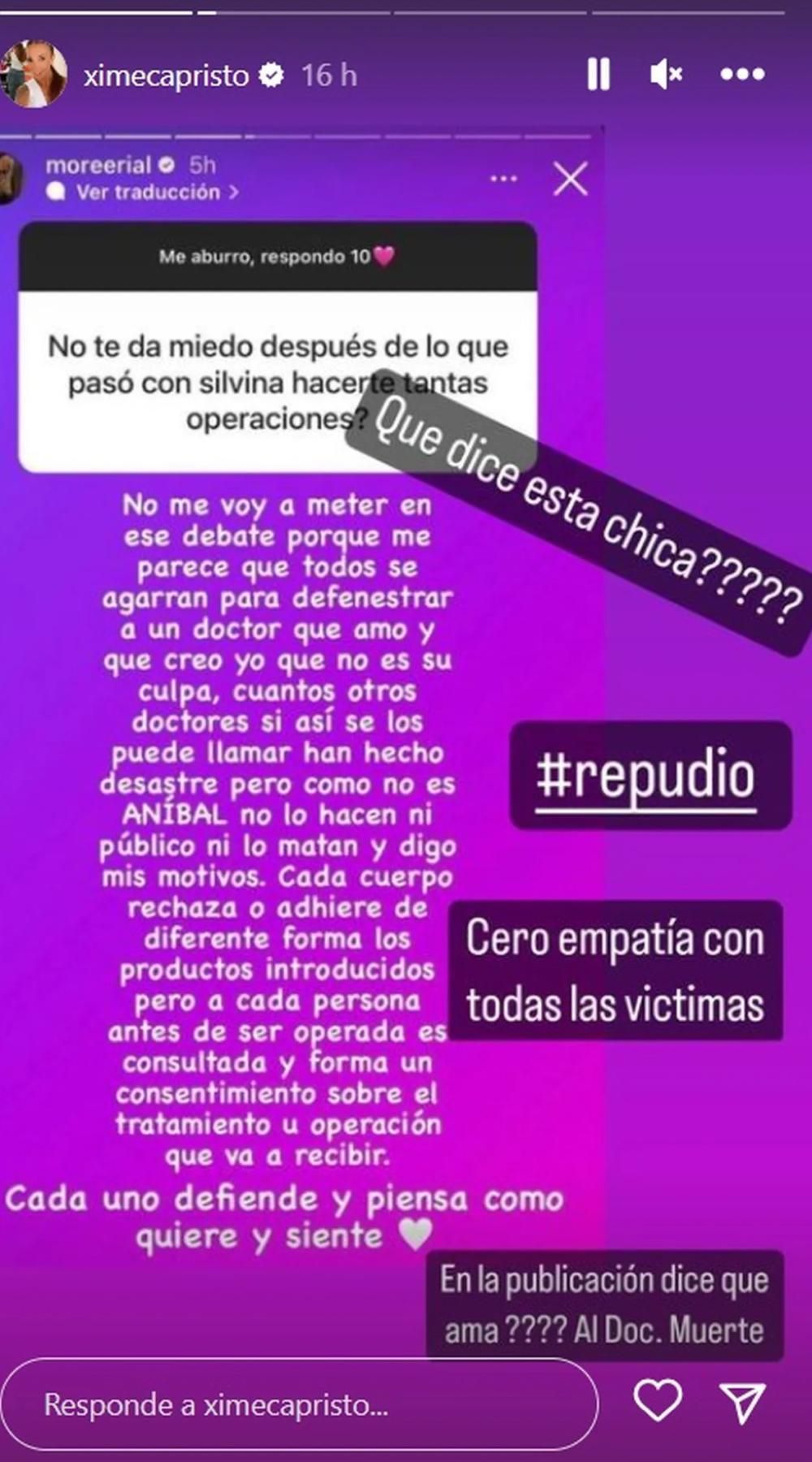 Ante esto, Ximena Capristo se manifestó en su cuenta en Instagram. "¿Qué dice esta chica? #Repudio. Cero empatía con todas las víctimas", escribió.
