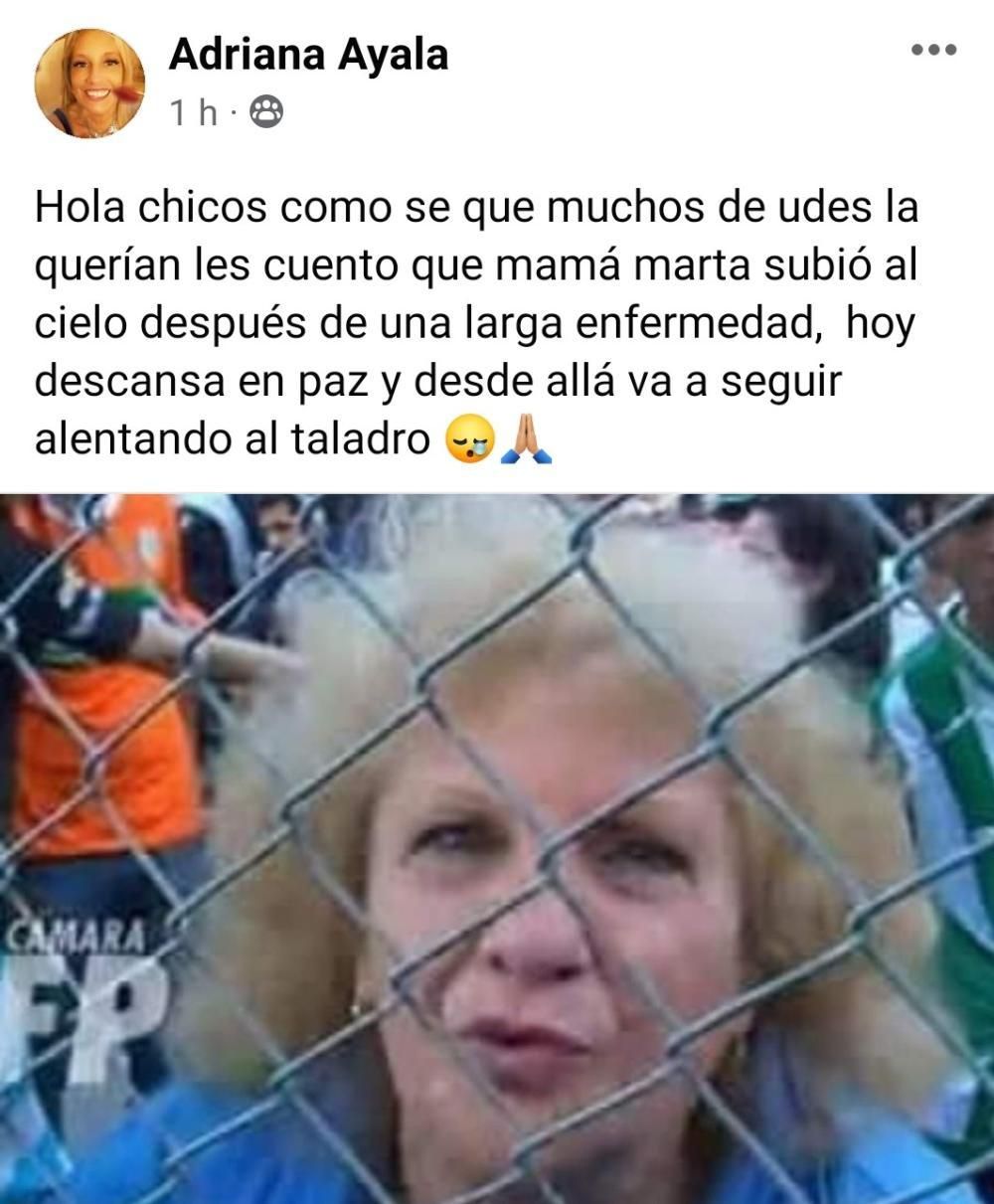 "Hola chicos como sé que muchos ustedes la querían les cuento que mamá Marta subió al cielo después de una larga enfermedad, hoy descansa en paz y desde allá va a seguir alentando al Taladro", informó su hija Adriana Ayala a través de Twitter. Su madre vivía a tres cuadras del Lencho, en Melo y Pueyrredón.