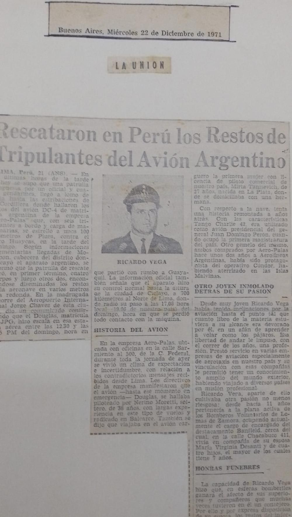 "Mi papá, era piloto comercial y jefe de los bomberos del destacamento de Banfield, perteneciente a Lomas. El 19 de diciembre de 1971, el avión en el que viajaba junto a otros seis tripulantes se estrelló en Perú: fallecieron todos los que iban a bordo", contó sobre el puntapié que lo llevó a redactar el texto de 186 páginas y 36 fotos a color (Editorial Pato de Lectura). El libro trata sobre la historia detallada del avión, sumado a las conjeturas e hipótesis que hizo el propio Ricardo tras una larga investigación y entrevistas personales.