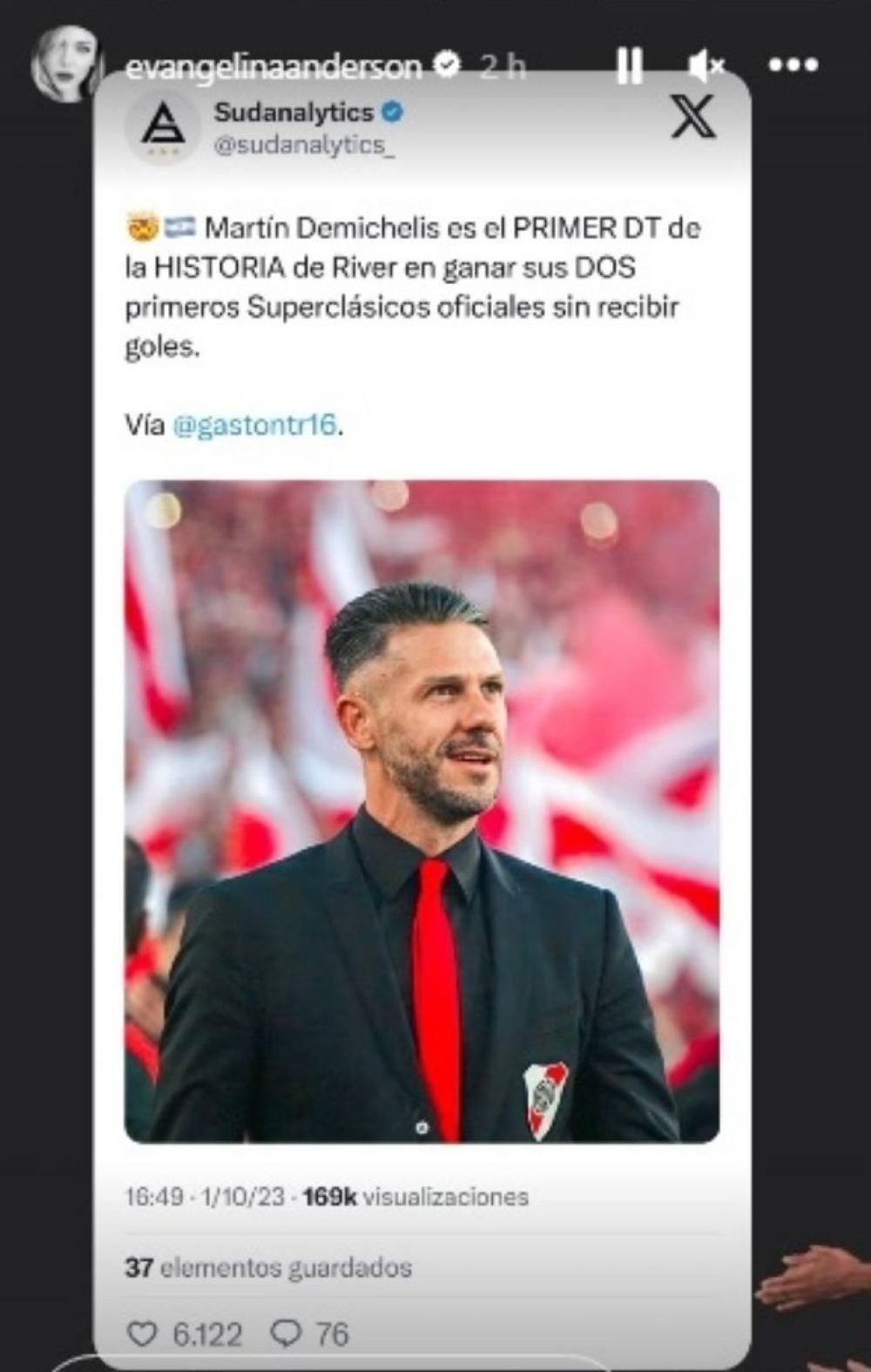 Finalmente, en la sección de historias en Instagram, Evangelina compartió un posteo en el que reconocieron a Demichelis como el primer DT en la historia de River Plate en ganar dos Superclásicos consecutivos sin recibir goles.
