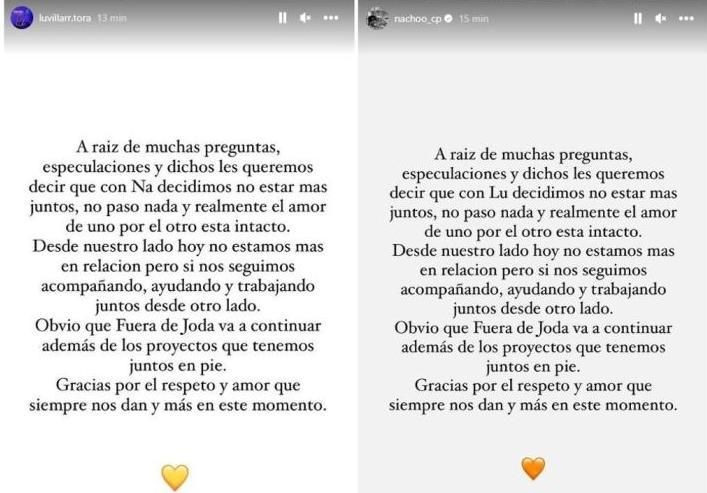 "A raíz de muchas preguntas, especulaciones y dichos, les queremos decir que con Na decidimos no estar más juntos. No pasó nada y realmente el amor de uno por el otro está intacto", comenzaron en el texto.