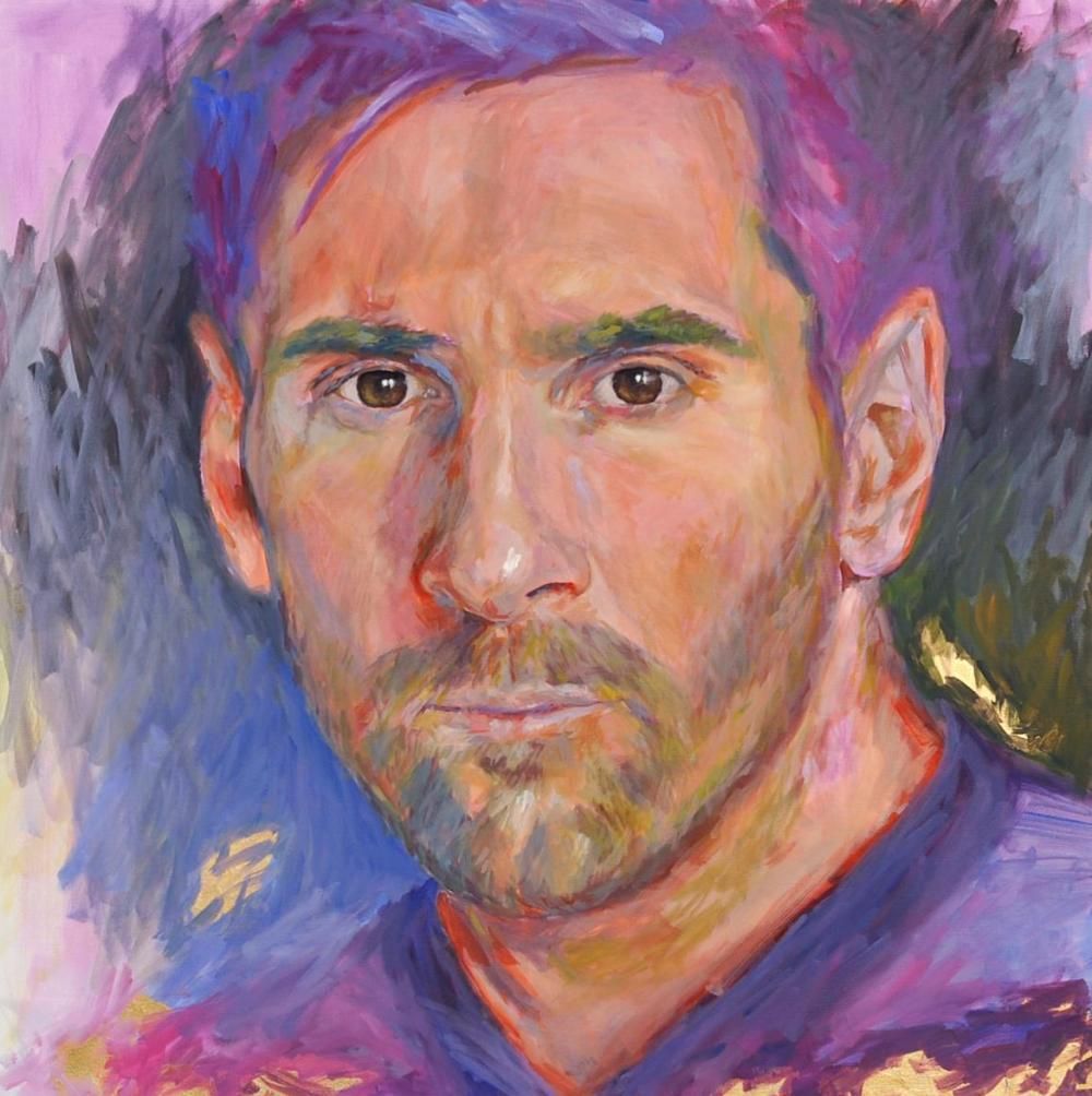El retrato de Messi, mirando sereno al frente, con la camiseta suplente de la Selección, la de color violeta, rodeado de un aura de pinceladas de colores que serpentean entre los tonos rosas y lilas, nació en octubre de 2022, previo al Mundial de Qatar.