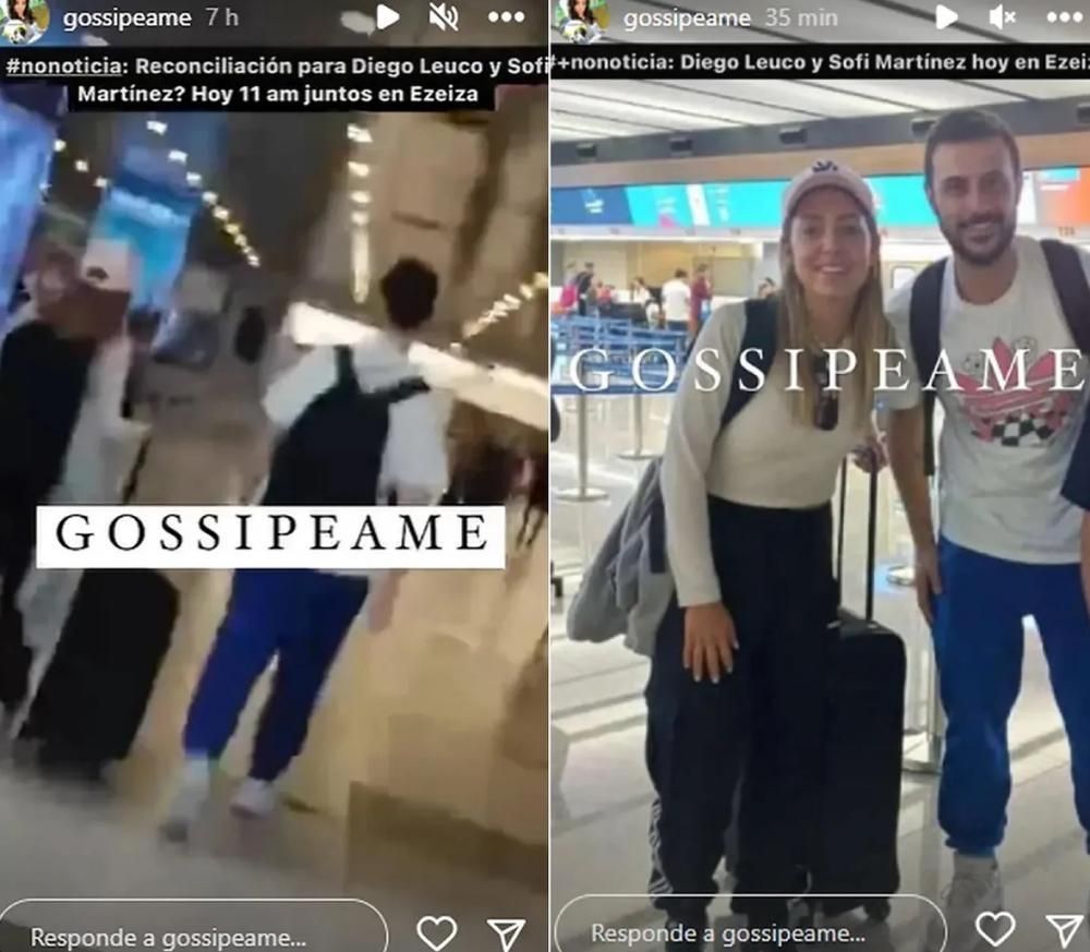 La cuenta de Instagram Gossipeame mostró la imagen de Sofi y Diego juntos en Ezeiza. "¿Reconciliación para Diego Leuco y Sofi Martínez? Hoy 11 am, juntos en Ezeiza", escribió Pochi, quien administra esa cuenta.