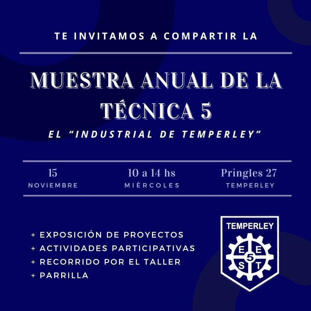 La Escuela Secundaria Técnica Nº5, más conocida como el Industrial de Temperley, se prepara para llevar adelante una muestra anual que tiene como fin exponer los proyectos y los trabajos en los que estuvieron trabajando los alumnos a lo largo del 2023. La jornada se hará el próximo miércoles 15 de noviembre, de 10 a 14, y es abierta para que participen los vecinos.