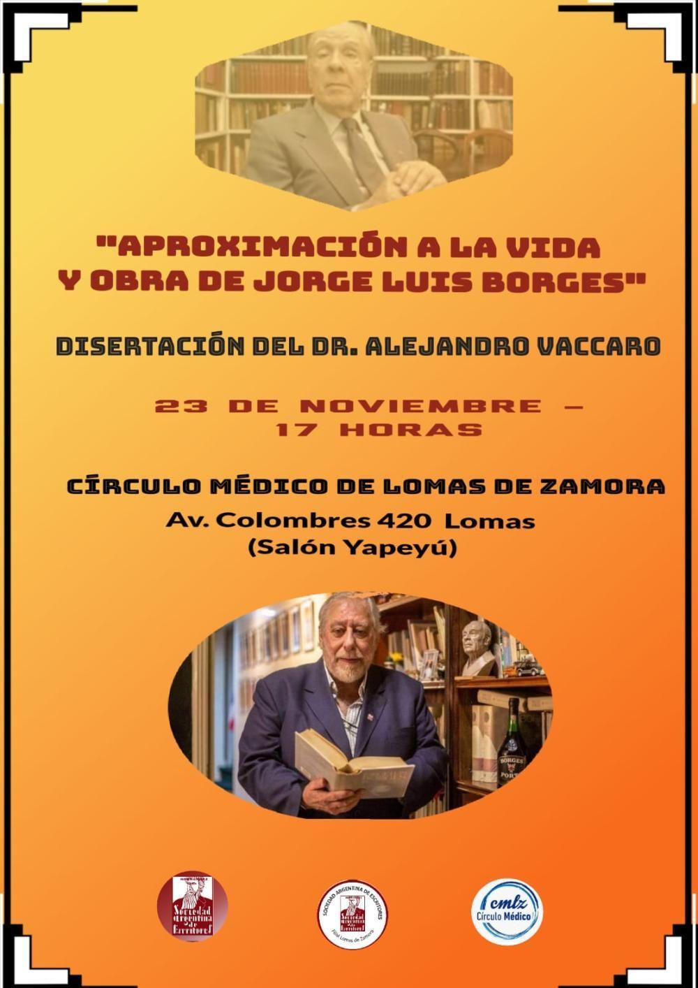 En el Círculo de Médico ubicado en Avenida Colombres 420, Lomas (Salón Yapeyú) se podrá conocer o recordar la obra de Borges gracias al doctor Vaccaro, quien además es una personalidad de la cultura nacional destacada. El encuentro se denomina "Aproximación a la vida y obra de Jorge Luis Borges".