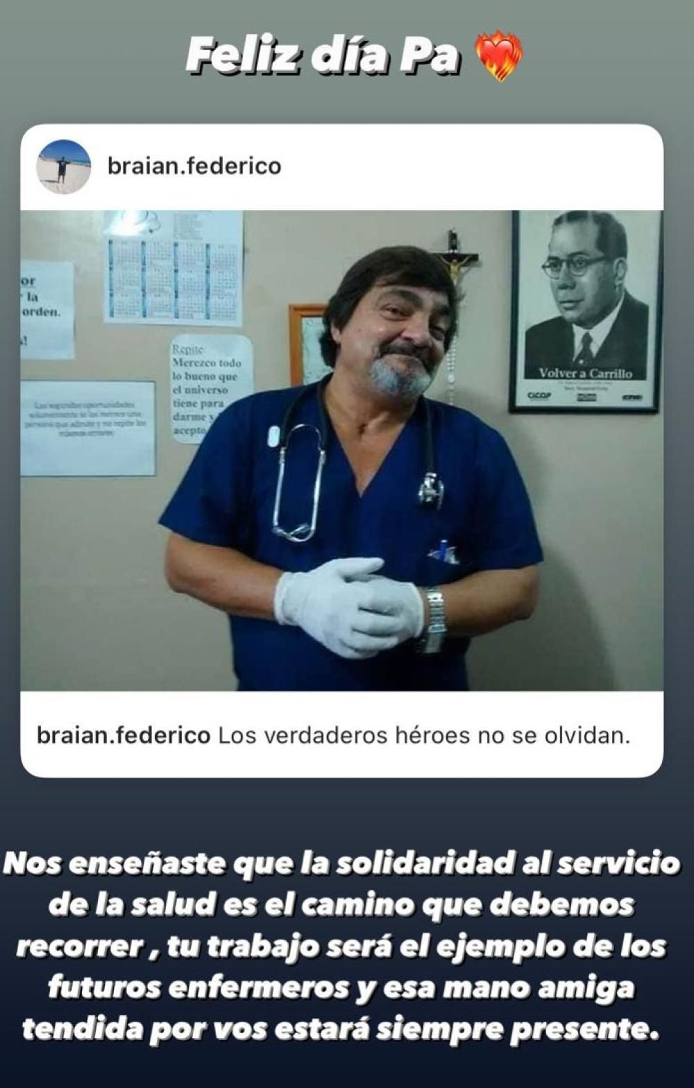 "Nos enseñaste que la solidaridad al servicio de la salud es el camino que debemos recorrer, su trabajo será el ejemplo de los futuros enfermeros y esa mano amiga tendida por vos estará siempre presente", escribió en una historia de su cuenta de Facebook acompañada por la foto de su padre.