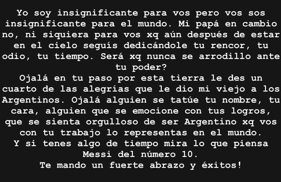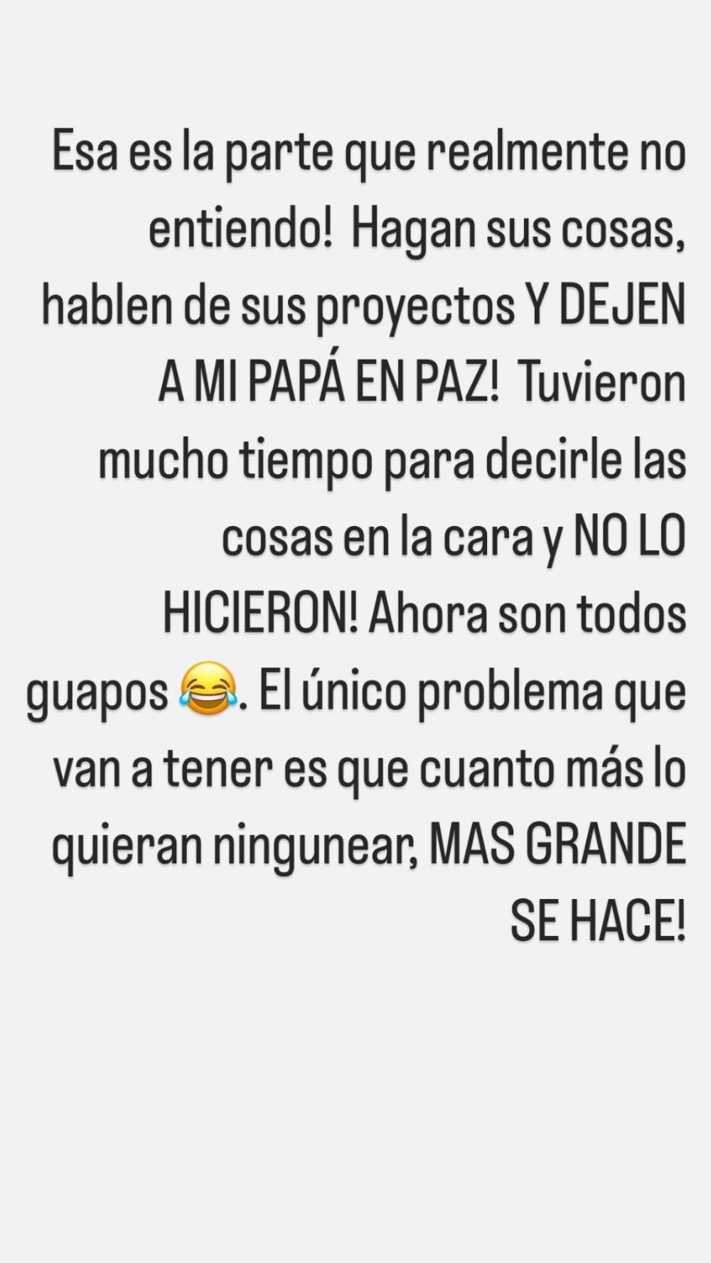 Por su parte, Dalma también publicó algunas historias, y en una escribió: "Esa es la parte que realmente no entiendo! Hagan sus cosas, hablen de sus proyectos Y DEJEN A MI PAPÁ EN PAZ! Tuvieron mucho tiempo para decirle las cosas en la cara y NO LO HICIERON! Ahora son todos guapos. El único problema que van a tener es que cuanto más lo quieran ningunear, MÁS GRANDE SE HACE!".