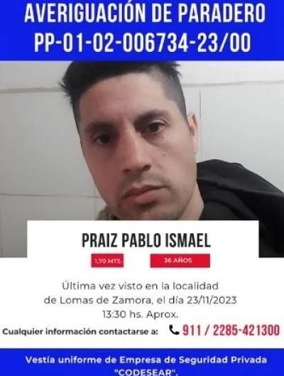 Pablo Ismael Praiz tiene 36 años, es oriundo de Laprida y no saben nada de él desde el jueves pasado, cuando viajó hacia Lomas de Zamora. Su familia y la Policía lo buscan con desesperación.