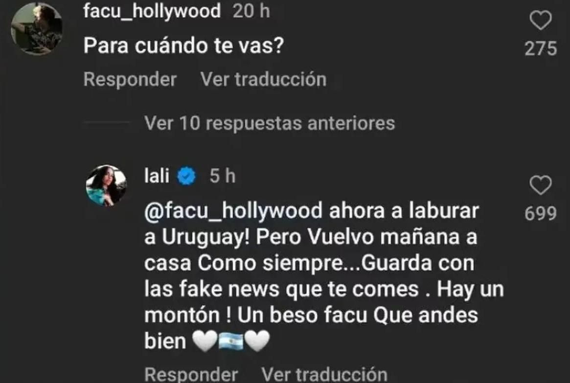"¿Para cuándo te vas?", le consultó un usuario de las redes sociales a la artista y de inmediato llegó una respuesta categórica.