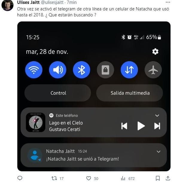 Ante esta aparición, el periodista expresó: "Otra vez se activó el telegram de otra línea de un celular de Natacha que usó hasta 2018 ¿Que estarán haciendo?". Esto último refiere a que el 14 de abril de 2023 denunció por primera vez que dicha línea se había encendido.