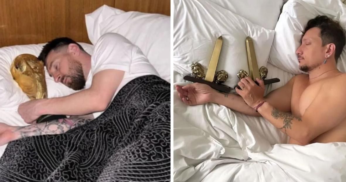 El actor celebró en Instagram con una foto a lo Lionel Messi durmiendo con sus estatuillas, como también lo hizo el futbolista cuando ganó La Copa Mundial de Qatar.