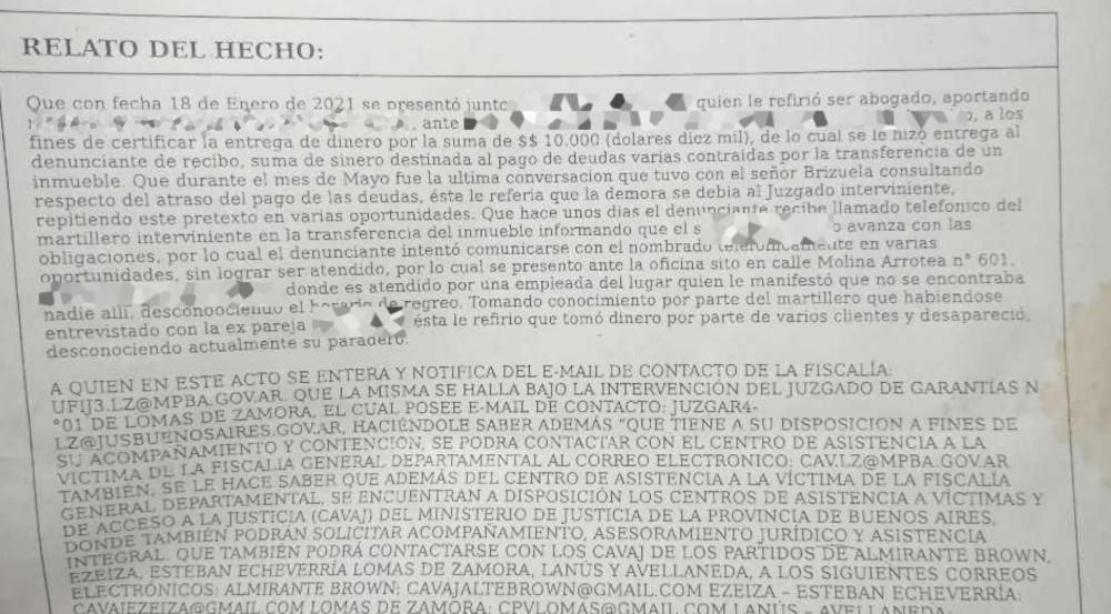 Es que el martillero interviniente le comunicó que el letrado que contrató no había cumplido con las obligaciones correspondientes.