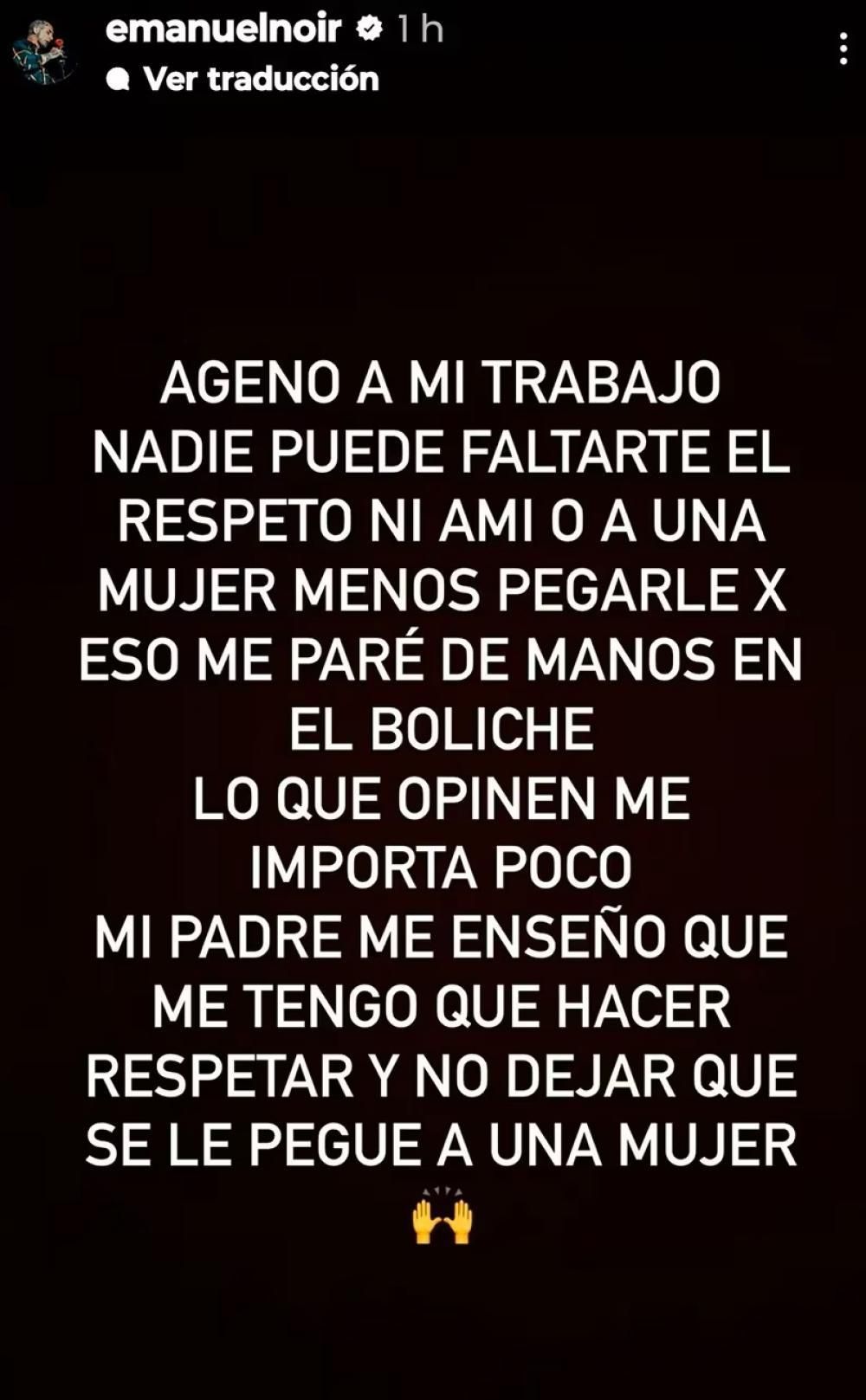"Ajeno a mi trabajo, nadie puede faltarle el respeto ni a mí o a una mujer, menos pegarle, por eso me paré de manos en el boliche. Lo que opinen me importa poco. Mi padre me enseñó que me tengo que hacer respetar y no dejar que se le pegue a una mujer", remarcó Noir.