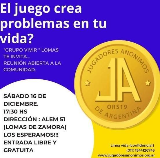 El Grupo Vivir de Lomas, espacio perteneciente a Jugadores Anónimos (J.A.) de Argentina, llevará a cabo una reunión abierta este sábado, dirigida a quienes tengan serias intenciones de salir del juego compulsivo o simplemente saber sobre una problemática que cada vez atrapa a más personas, sobre todo los jóvenes mediante las apuestas deportivas online.