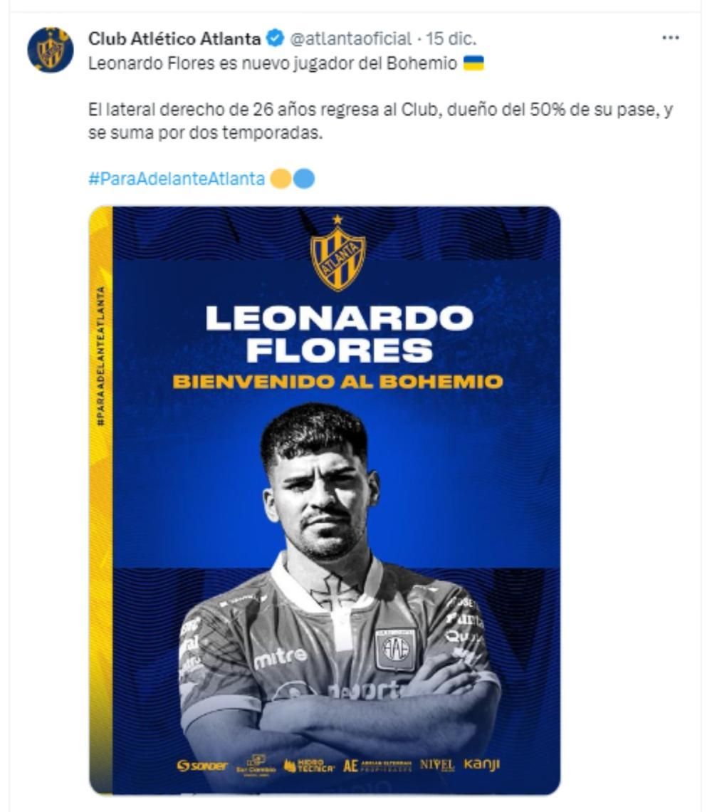 Tras su paso por el León, el lateral derecho rescindió su vínculo con el Taladro y se sumó otra vez a Atlanta, con el 50% de su pase en su poder, por dos temporadas.