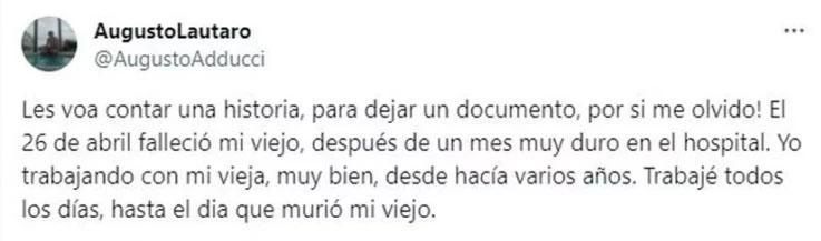 "Les voy a contar una historia para dejar un documento, por si me olvido. El 26 de abril falleció mi viejo, después de un mes muy duro en el hospital. Yo trabajando con mi vieja, muy bien, desde hacía varios años. Trabajé todos los días, hasta el día que murió mi viejo", comenzó Augusto a contar en un hilo en las redes que publicó en 2021.